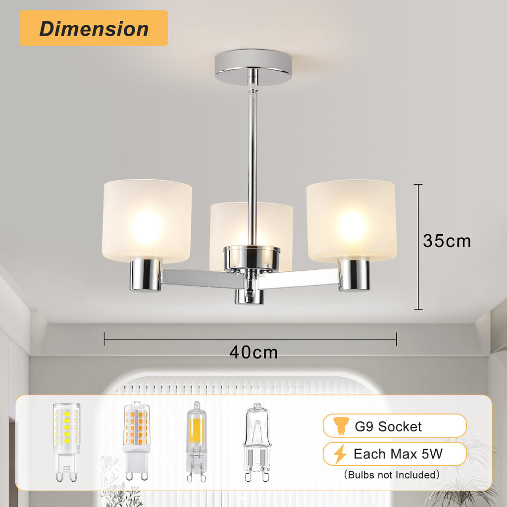 - CHANDELIER SPECIFICATIONS: Measuring 40cm x 40cm x 35cm, semi flush ceiling light operates on a 220-240V voltage and accommodates G9 bulbs with a maximum power of 3x5W. This light is dimmable compatible and is perfect for use with G9 LED lamps. (Note: Bulbs and dimmers are not included.)
