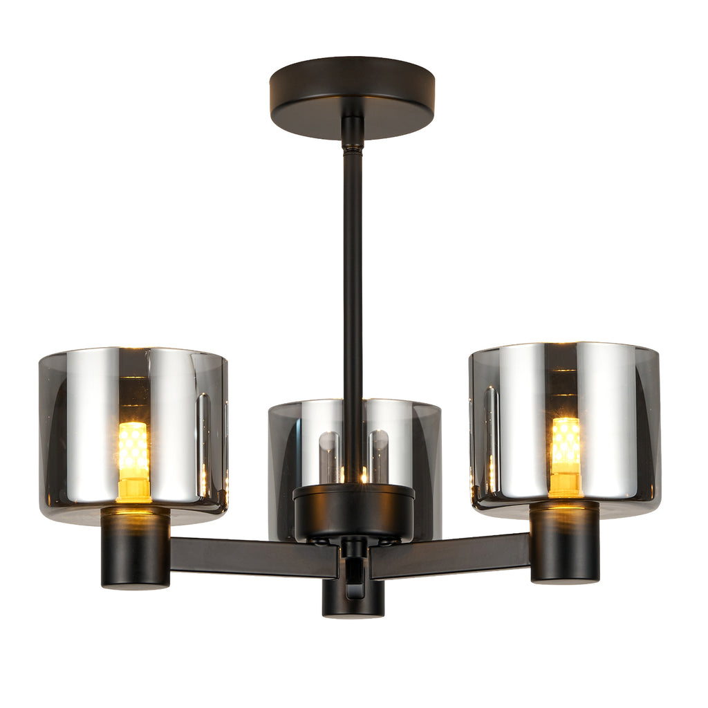 3 Lights Semi Flush Ceiling Lamp with Smoked Glass Shades, Matt Black