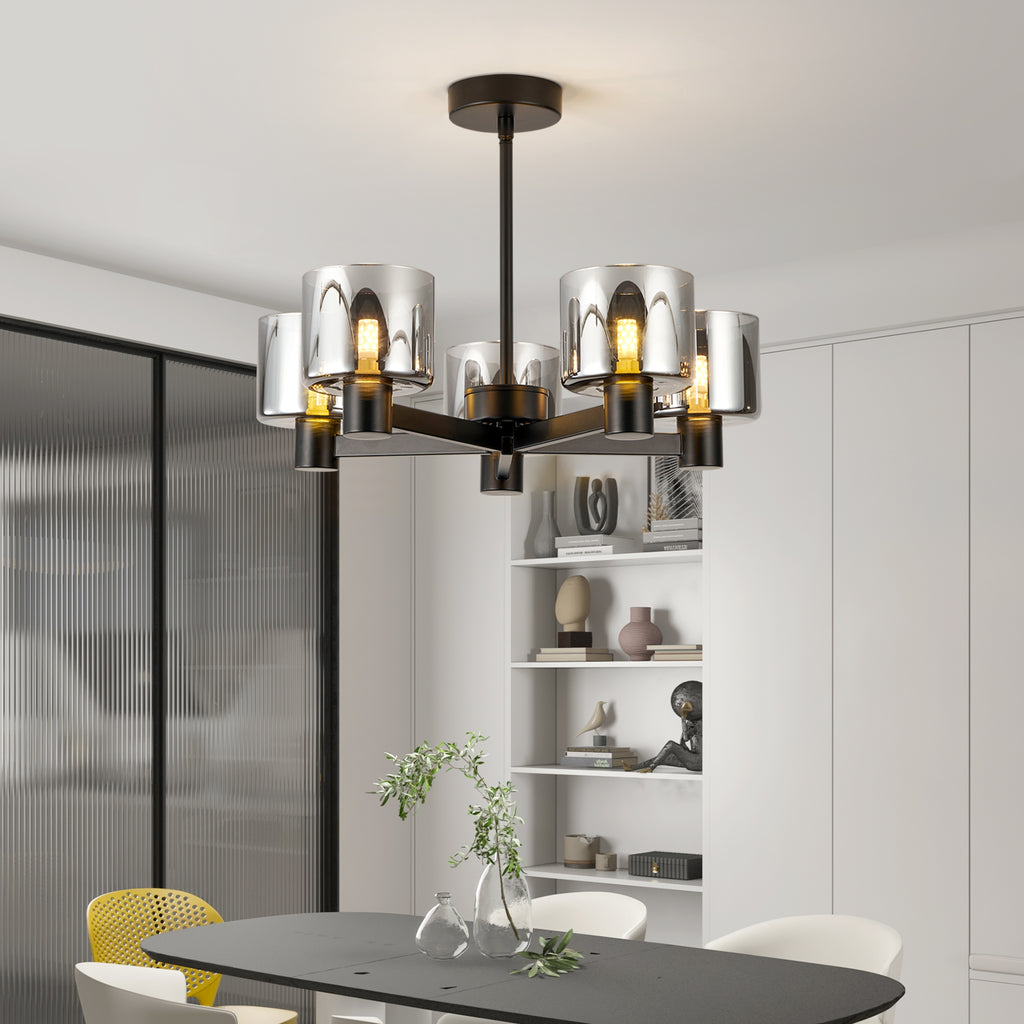 This modern chandelier features a sleek black metal frame with five cylindrical smoked glass shades. Each shade houses a warm LED bulb, casting a soft, ambient glow. The minimalist design and symmetrical layout blend industrial and contemporary aesthetics, making it an elegant lighting centerpiece for dining rooms, living spaces, or entryways.