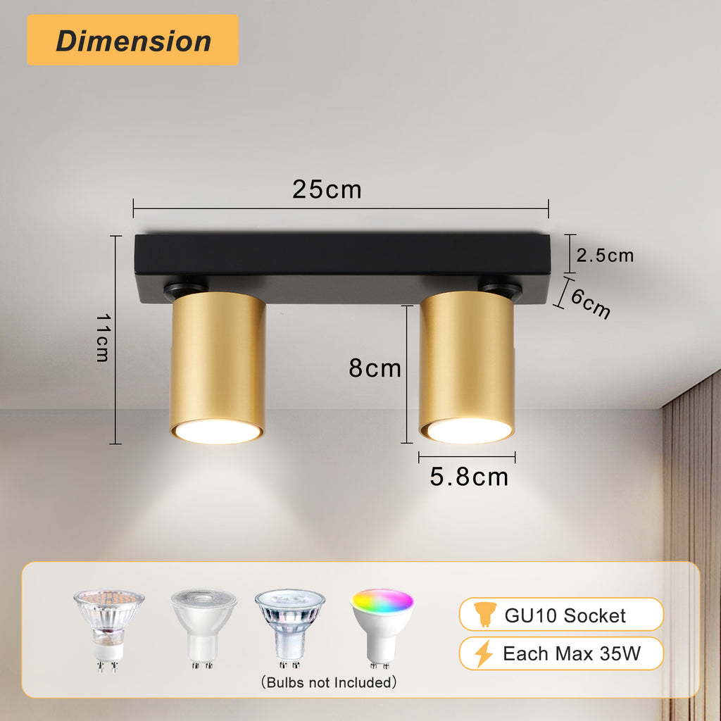 This sleek dual-head track light combines practicality and modern style, featuring a matte black bar with two adjustable gold cylinder lamps. Each head can be independently positioned to direct light precisely where needed, making it ideal for highlighting artworks, workspaces, or accenting key areas of a room. The contrasting colors add a contemporary flair to any decor, enhancing functionality with a touch of elegance.
