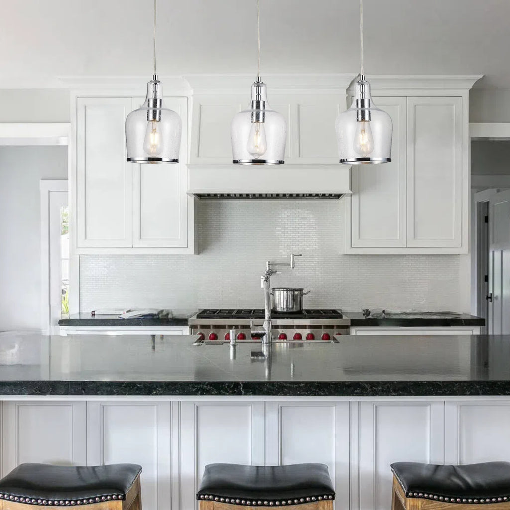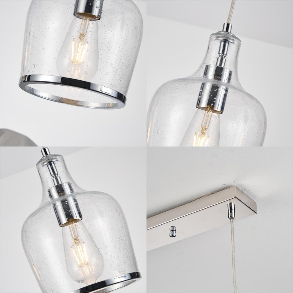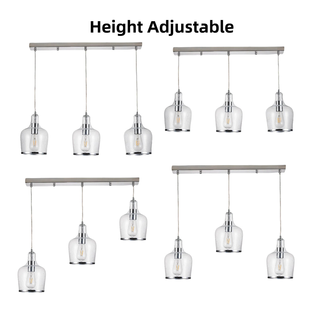 This 3-light pendant fixture features clear seeded glass shades and a Polished Chrome canopy, offering a perfect mix of industrial and modern design. Ideal for kitchen islands, dining tables, or loft spaces, it provides warm, ambient lighting while making a stylish statement in any contemporary interior.