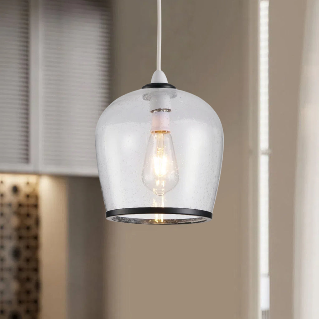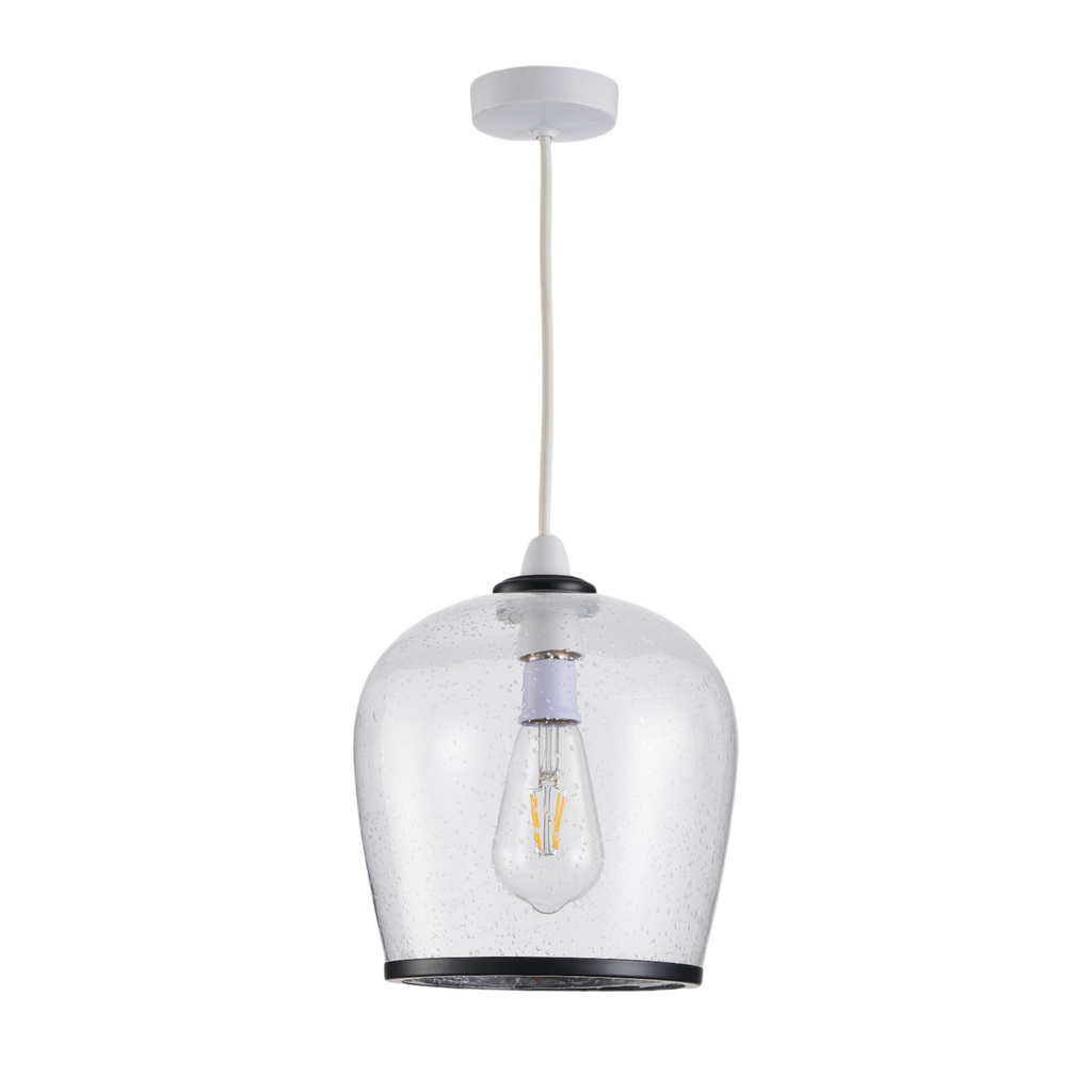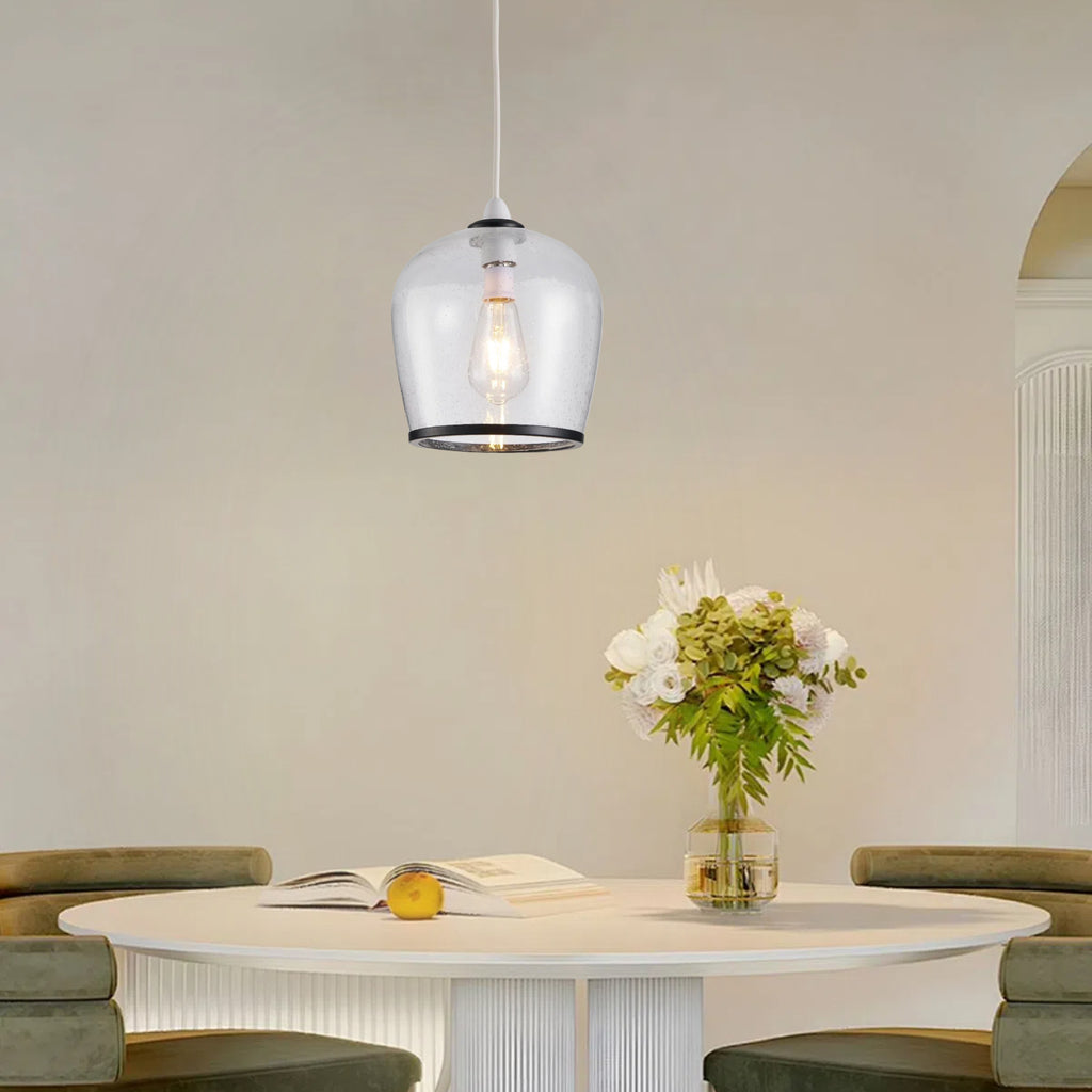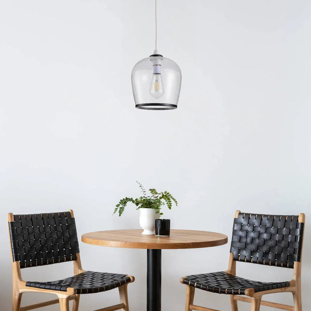 This easy-fit pendant shade features a clear seeded glass design with a softly curved silhouette and black trim. Its versatile style complements both modern and vintage interiors, effortlessly refreshing any space. No electrician required—simply attach to an existing ceiling fitting for an instant lighting upgrade with stylish charm.