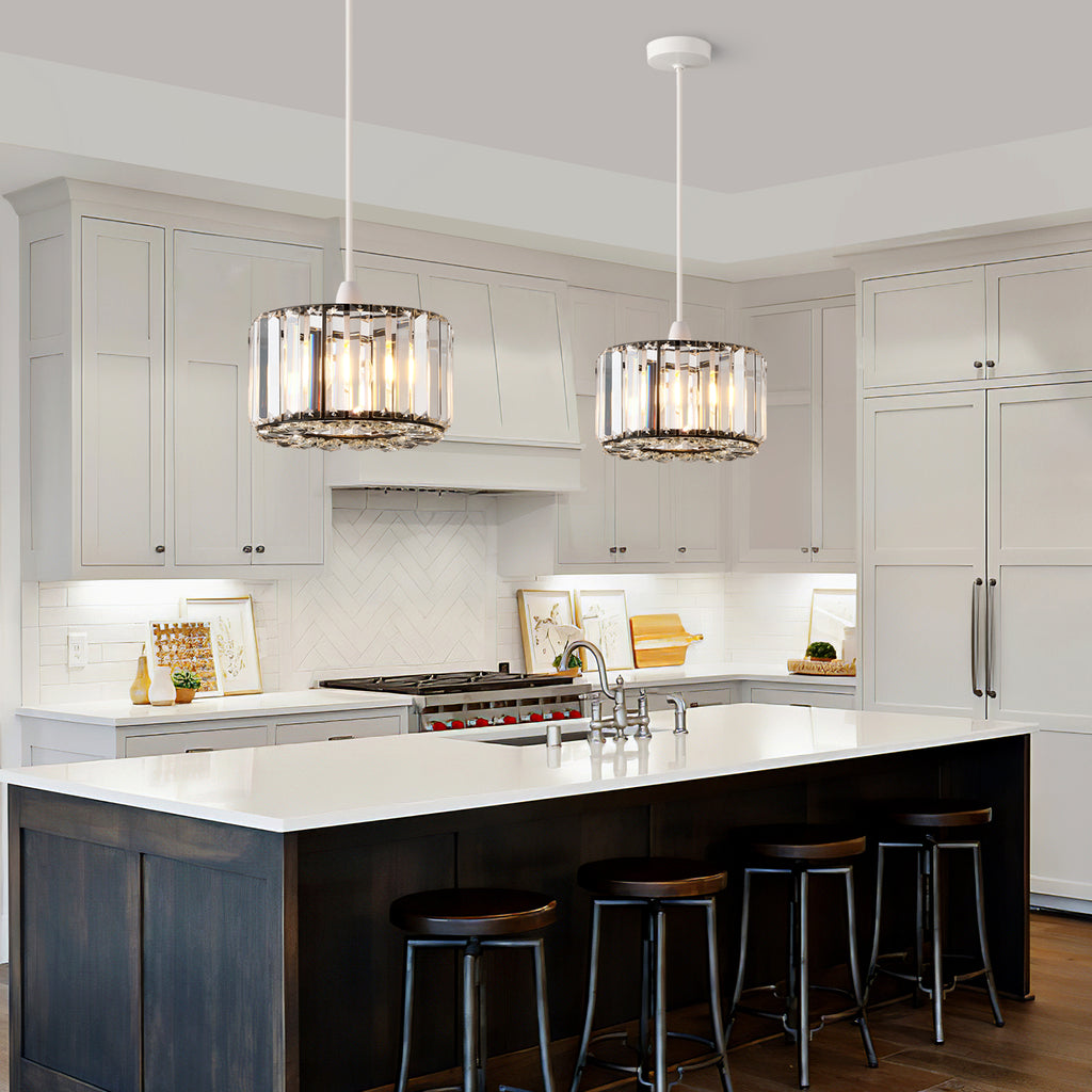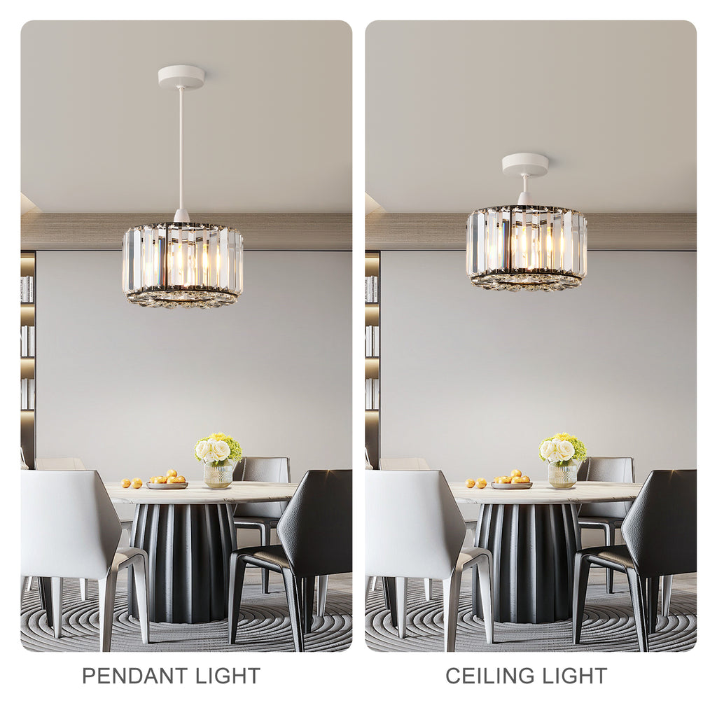 Illuminate your space with sophistication using this elegant easy fit crystal pendant light. Featuring vertical clear prisms and a sleek metal frame, it radiates luxurious charm while casting a warm, inviting glow. Ideal for dining rooms, living areas, or bedrooms, this fixture seamlessly combines modern elegance with timeless brilliance.