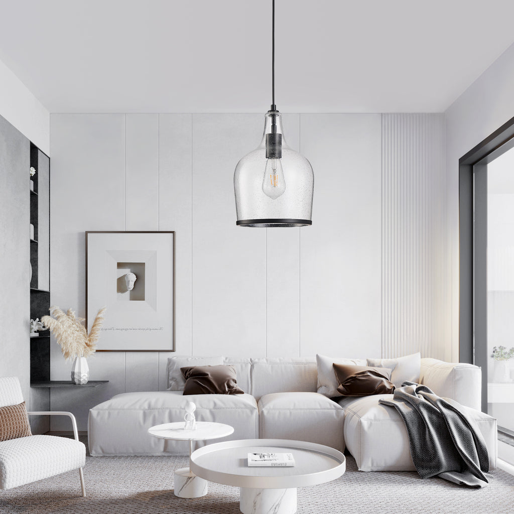 This glass pendant ceiling light features a clear seeded glass shade and a classic black fixture, blending vintage charm with modern elegance. Ideal for kitchens, dining areas, or entryways, it provides warm, focused illumination while showcasing the exposed bulb design for an industrial-inspired yet timeless aesthetic.