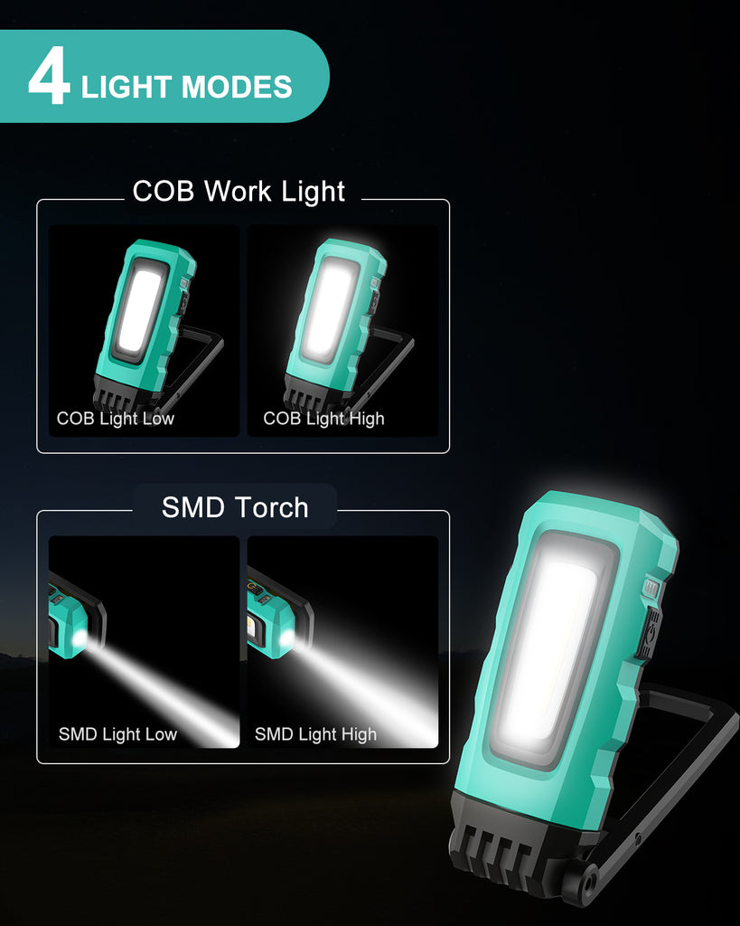 - COB & SMD 4-WAY WORK LIGHT- This KOOLITE work light offers 4 lighting modes: COB Low (200 lumens, 10 hrs), COB High(800 lumens, 2.5 hrs), SMD Low (50 lumens, 20 hrs), SMD High (300 lumens, 4 hrs). The COB light provides a powerful white floodlight, while the SMD light serves as a standard flashlight.