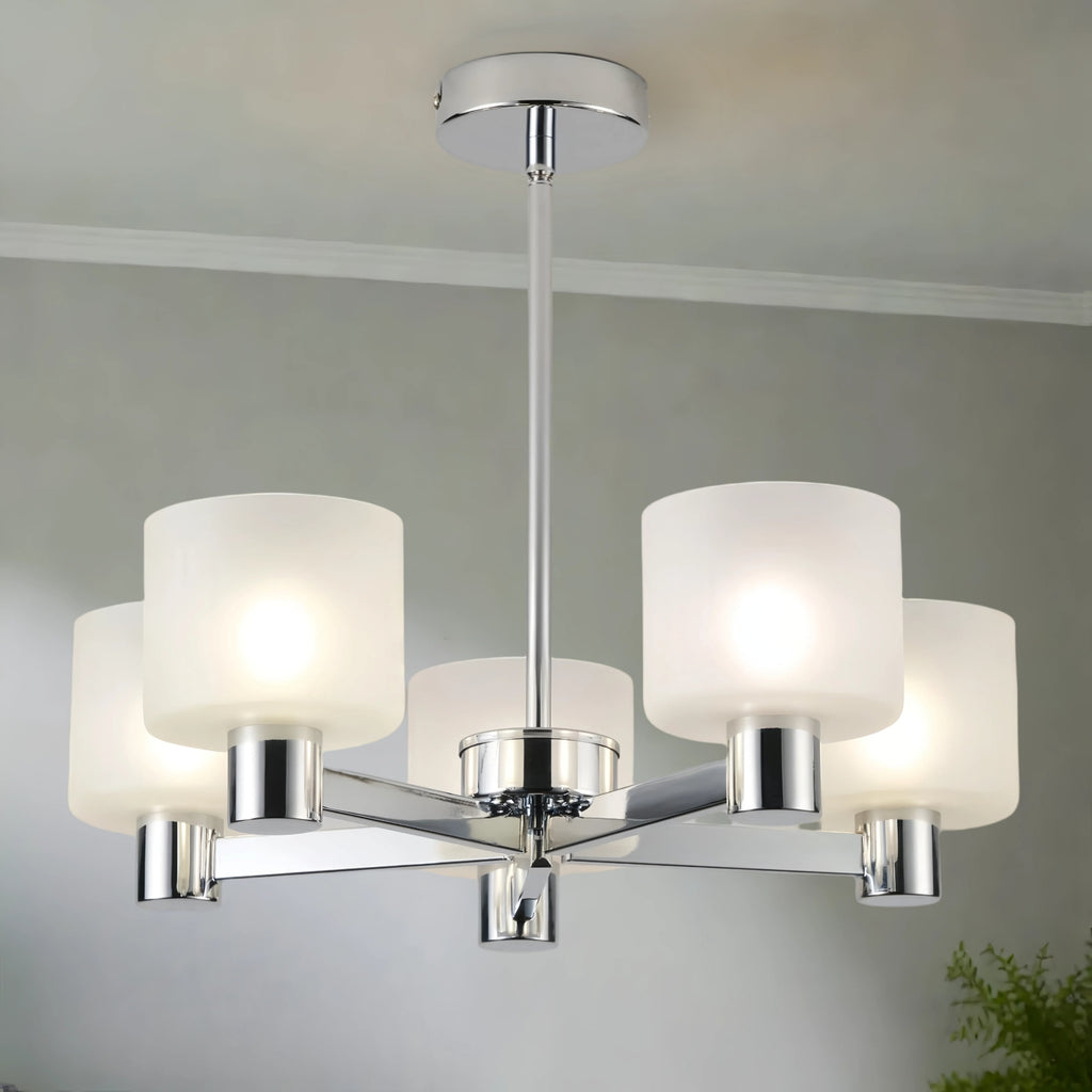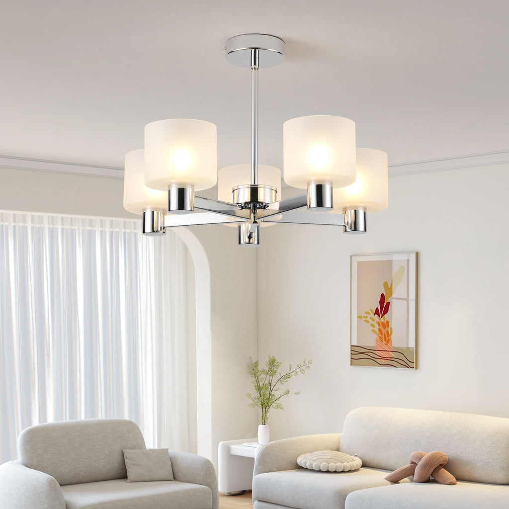 This modern chandelier features a sleek chrome finish and five frosted glass shades, offering soft, ambient lighting. Its minimalist design blends elegance and functionality, making it ideal for dining rooms, living spaces, or entryways. The sturdy metal construction ensures durability while adding a contemporary touch to your home decor.
