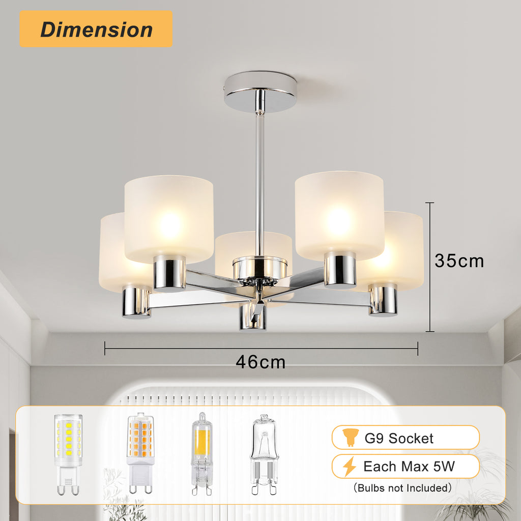 - CHANDELIER SPECIFICATIONS: Measuring 46cm x 46cm x 35cm, semi flush ceiling light operates on a 220-240V voltage and accommodates G9 bulbs with a maximum power of 5x5W. This light is dimmable compatible and is perfect for use with G9 LED lamps. (Note: Bulbs and dimmers are not included.)
